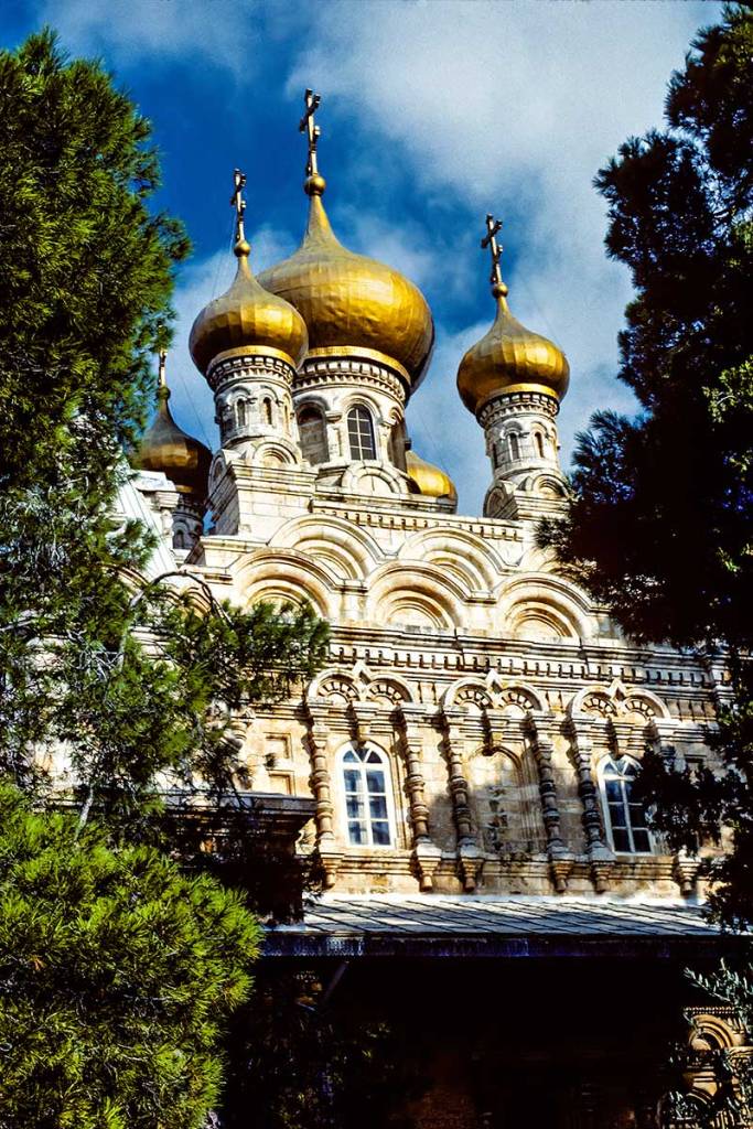 Church of Mary Magdalene is a Russian Orthodox church as indicated by the seven gilded onion domes, each topped by a tall cross.