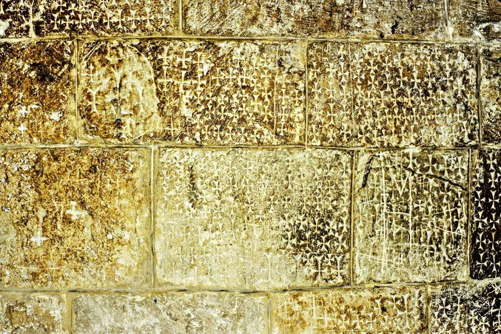 The crosses on the wall were carved by pilgrims.