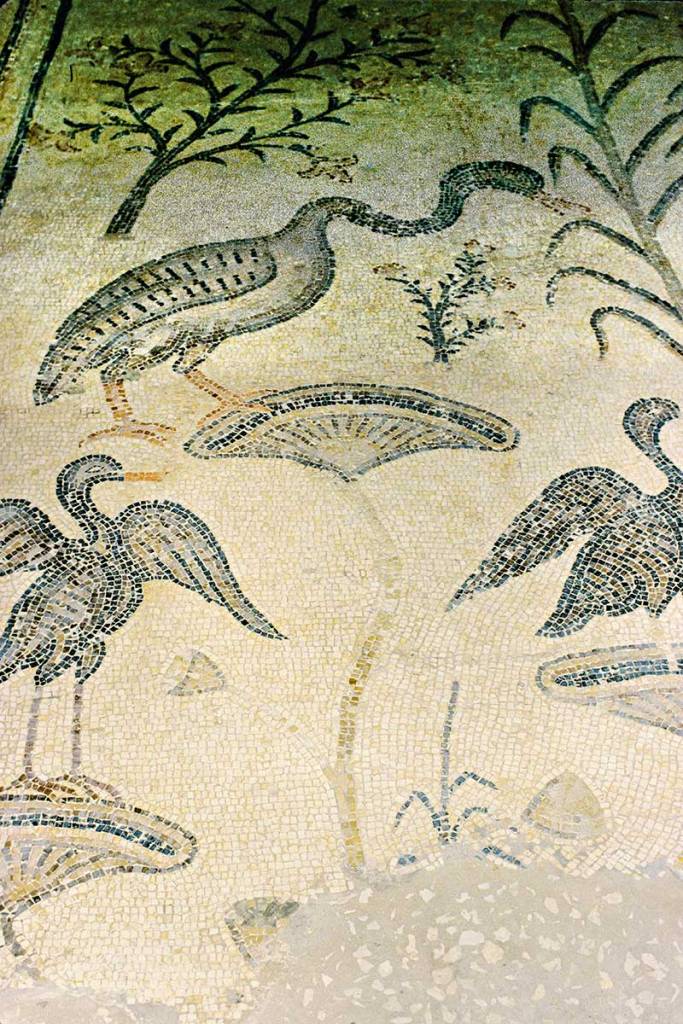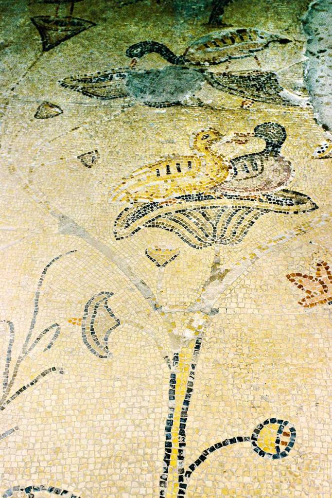 Tabgha was the location of the multiplication of loaves and fishes episode in the Bible. In the ruins of a 6th century church we found Byzantine mosaics of birds on flowers. Is that a lotus? The church was destroyed by the Persians in 614 and lost until the 20th century!