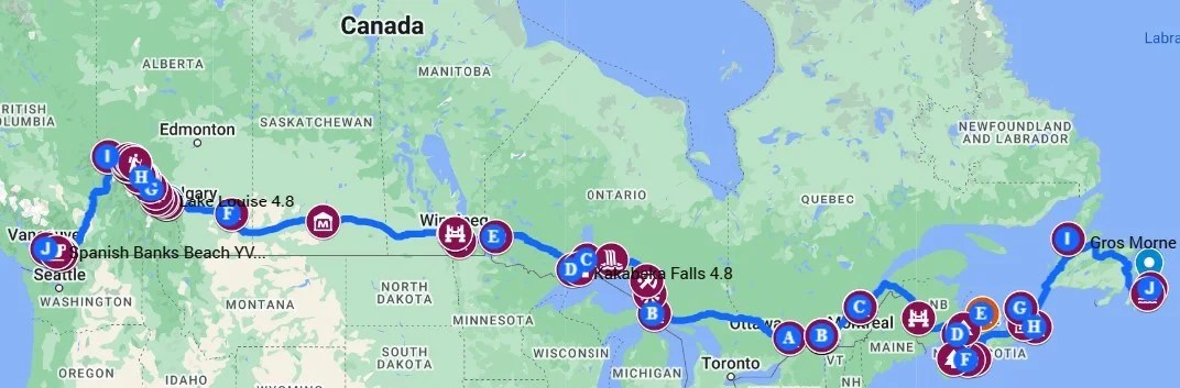 If you have unlimited time, a typical trip plan is shown in the Cross-Canada Travel Itinerary Map. The western itinerary crosses the part of Canada from Ottawa to Vancouver. Since only ten stops per driving segment are allowed by Google Maps, the distance will be well over the calculated 4835 km one way. This is about the same as driving from London, UK, to Tabriz, Iran (4,893 km)! It takes 4.5 days of non-stop driving to travel from Ottawa to Banff.