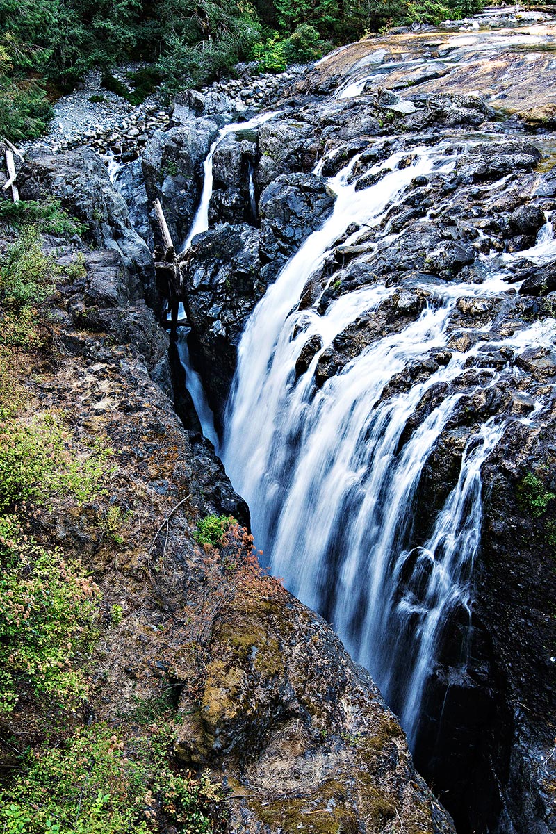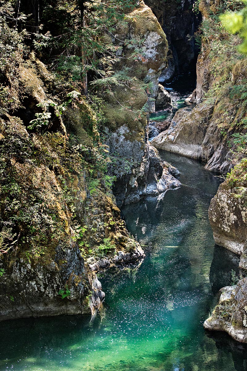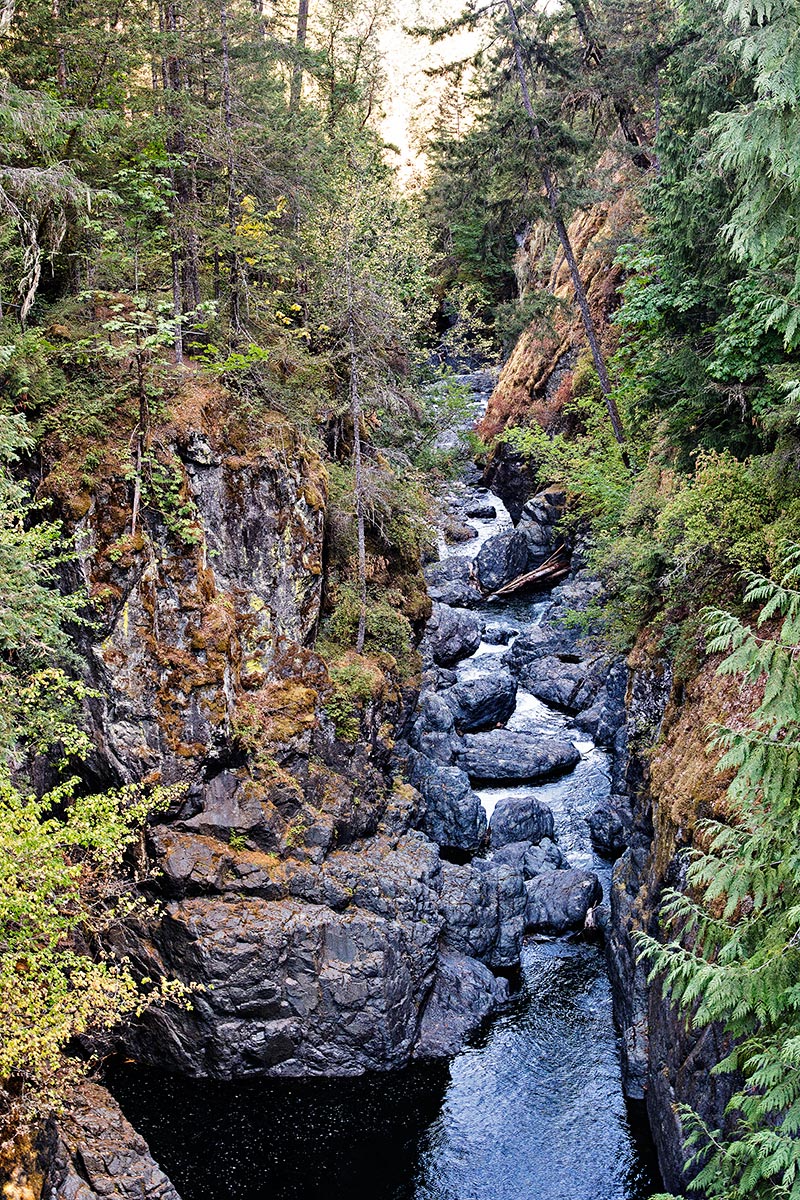Not long after Nanaimo, exit the Inland Island expressway (Hwy 19) for the Englishman River Falls Provincial Park (PP). From the day use parking lot you want to take the trail that parallels bot sides of the river crossing two bridges and loops back to the parking lot. It’s a short, easy trail. See the Englishman River Falls Provincial Park map.