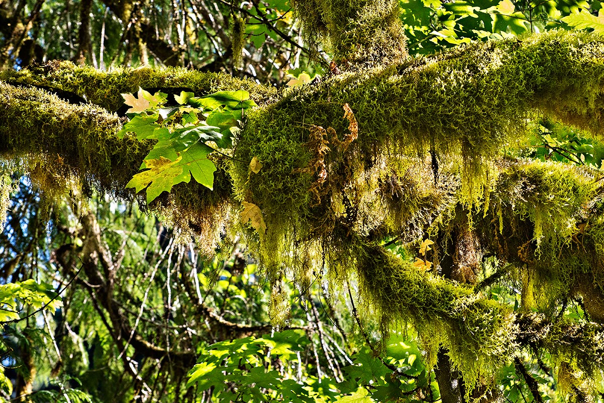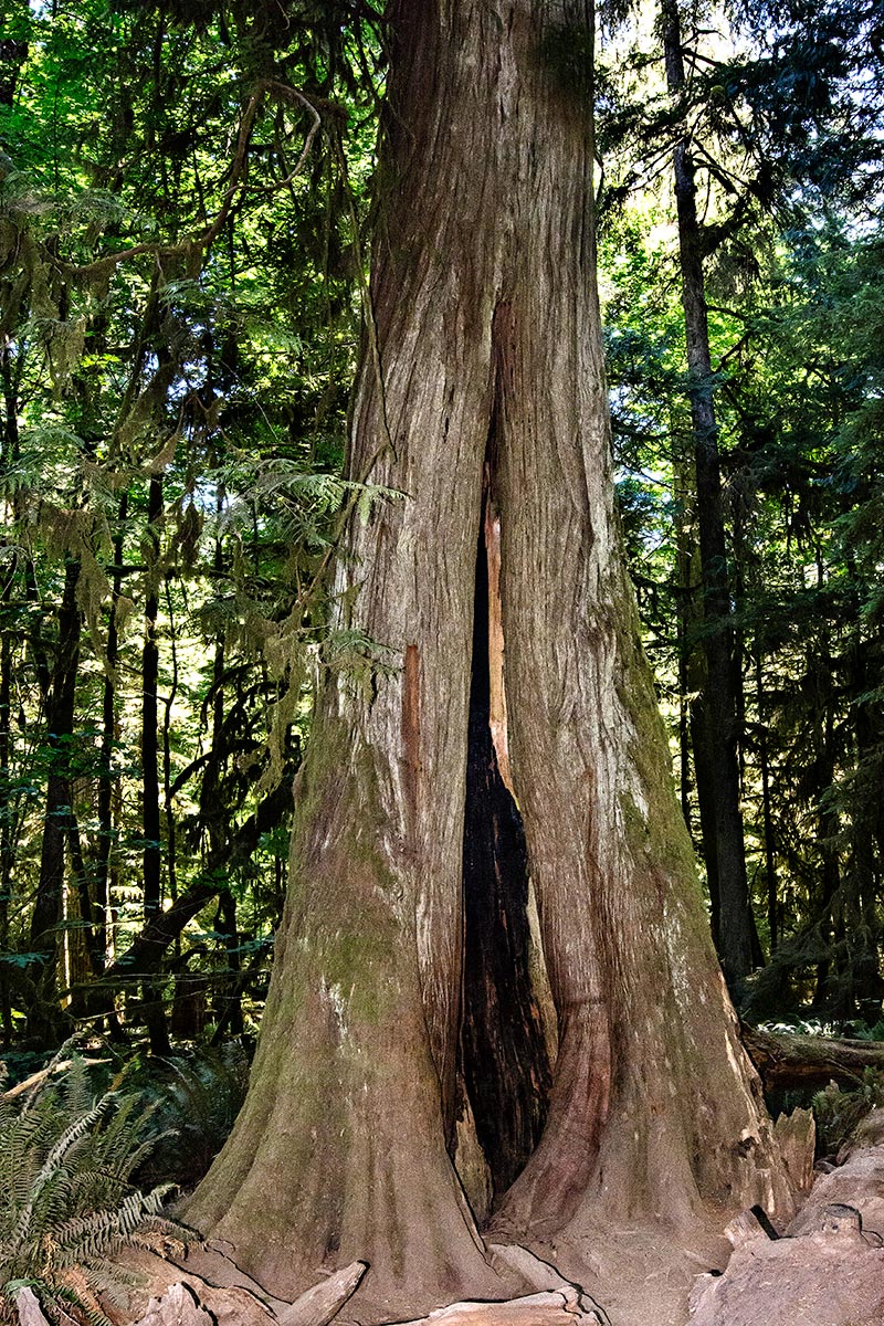 Cathedral Grove had some gigantic douglas fir trees but a severe windstorm in 1997 toppled many huge trees. This tree is one of the few older trees that could be photographed from the trail. Also enjoy the hanging ferns as you walk.