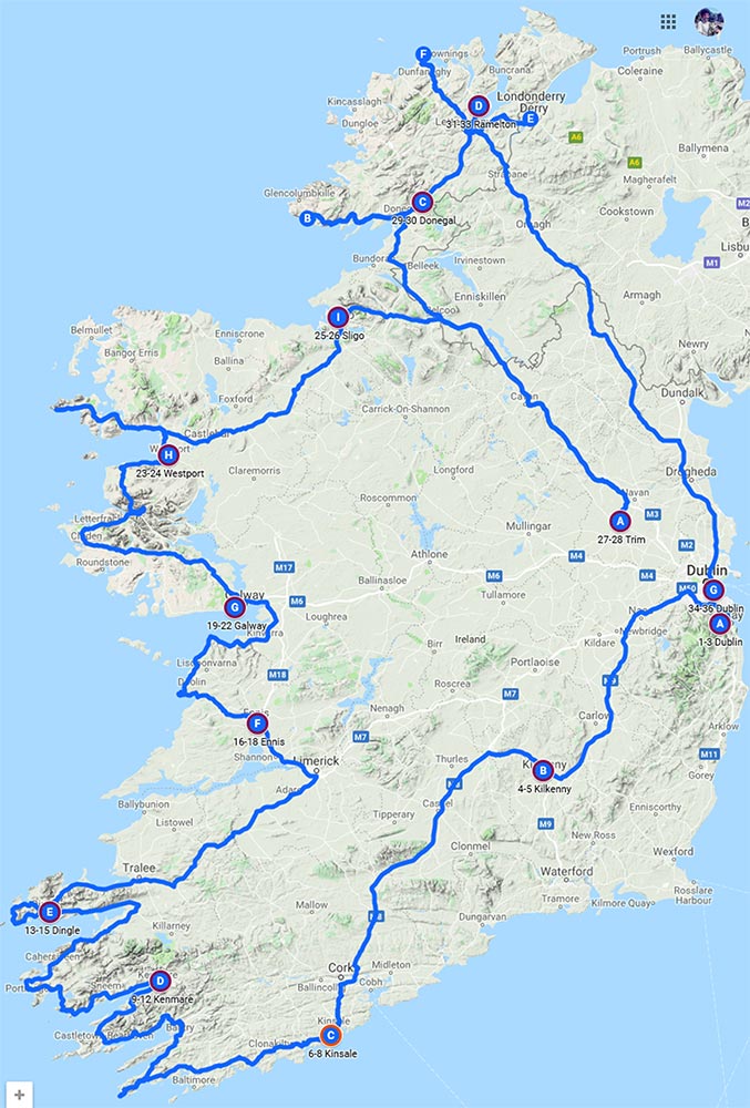 This summary map does not show the specific sights but focuses on the towns we chose as our base camp for 2 to 4 days. There are many other nearby alternatives. Each stopover name is prefixed by a Start and End Day Number beginning with day 1 seeing Powerscourt Gardens and Glendalough and ending with day 36 in Dublin.