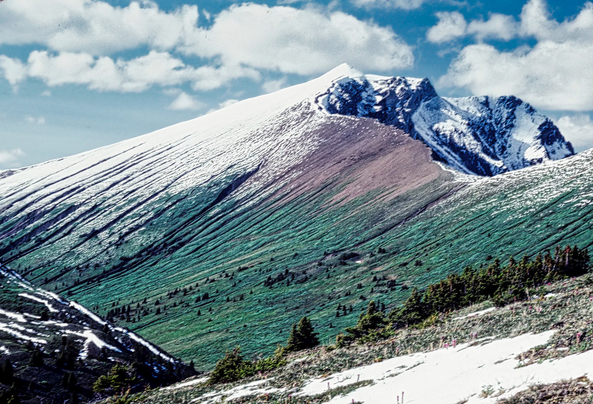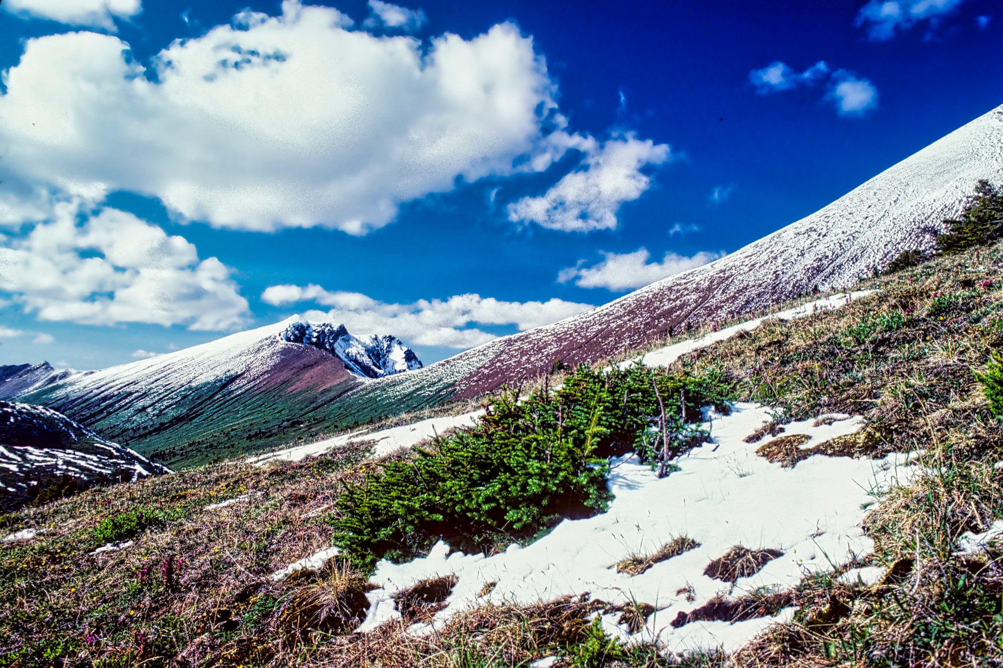 We did not have perfect weather but the views were still spectacular. The trail continues along a tilted mountain meadow dusted with snow.