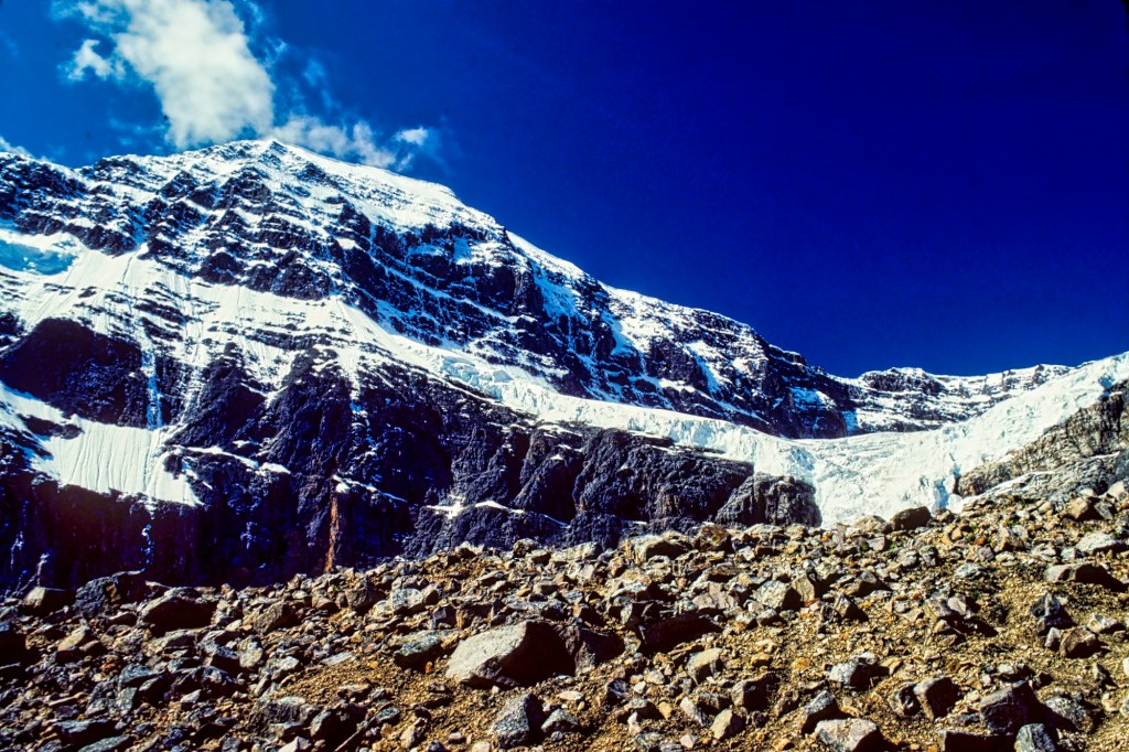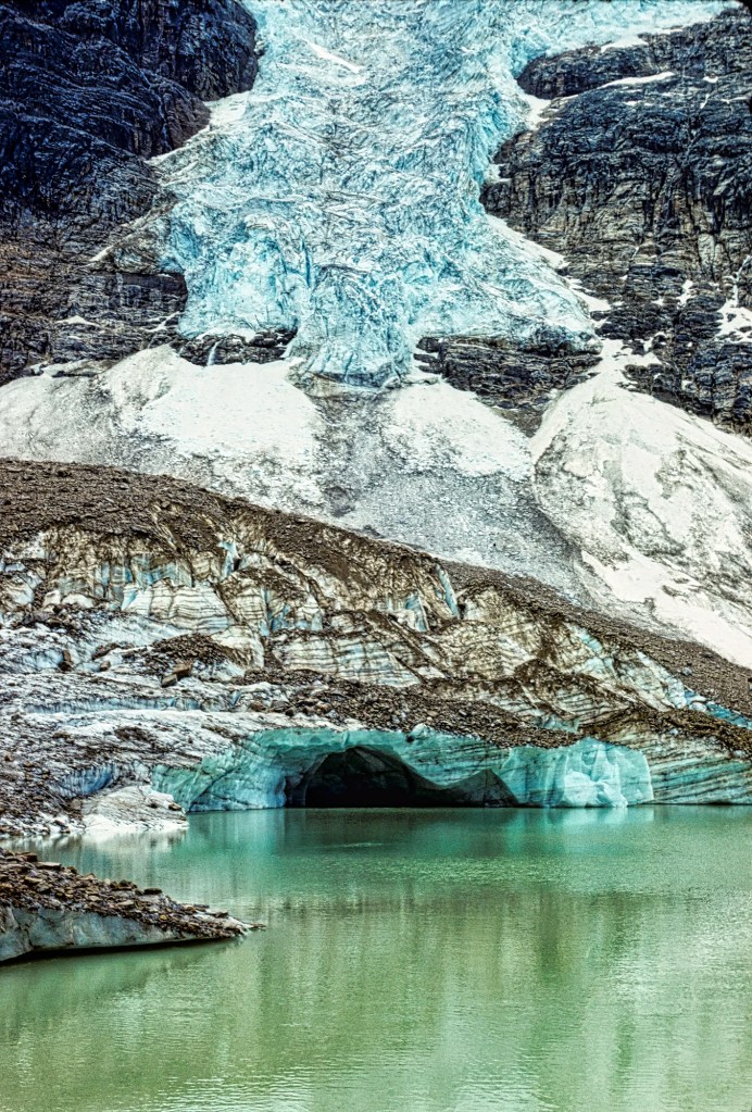 Cavell Glacier is a remnant of an ancient glacier at the bottom of the mountain. The rock-strewn ice is melting into the glacial tarn. I spent an inordinate amount of time taking photos of the icebergs floating in the tarn. Note that glacial ice reflects various shades of blue, especially in the shade areas. The ice fall above Cavell Glacier is the separate Angel Glacier. But it will no longer look like this, as it has since melted back.