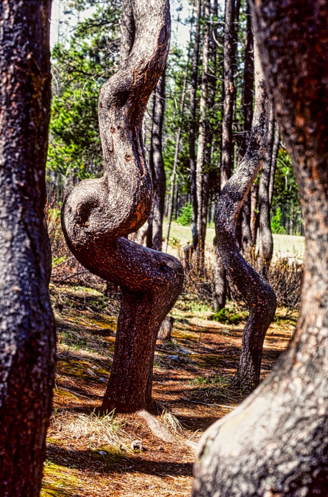 Lodgepole pines are slender, tall, vertical pines. This forest was felled by a forest fire. But lodgepole pine cones are fire resistant. So new trees grew up and had to twist and turn to work their way up past the fallen spars. It’s a great place for family photos framed by the twisted trees.
