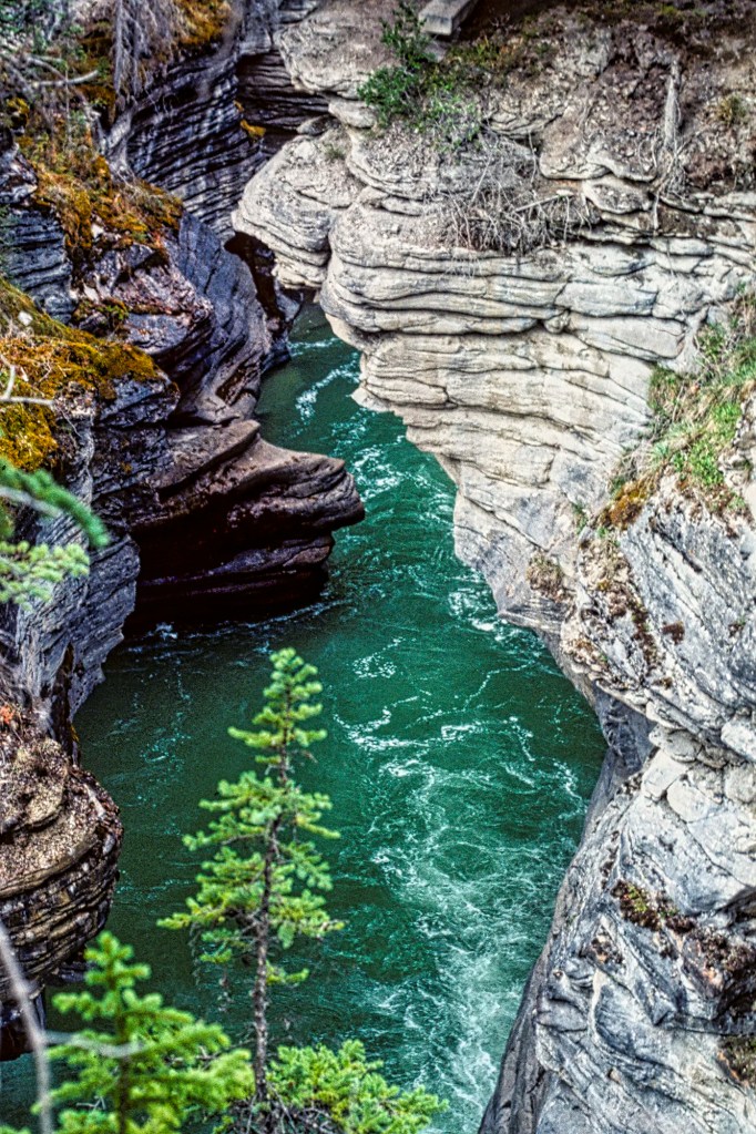 This is a very easy and busy walk, only 12 km (7.5 mi) east of Jasper town. It is definitely worth doing to see how water can carve a canyon, albeit a very narrow one. Cascades cast swirling (glacial) green water into potholes carved into the canyon walls. The railings were erected because many tourists went too close to the edge and fell to their death up to 50 m (165 ft) below. Before the guard rails, we remember seeing tourists walking at the canyon edge, vying for the Darwin Award.