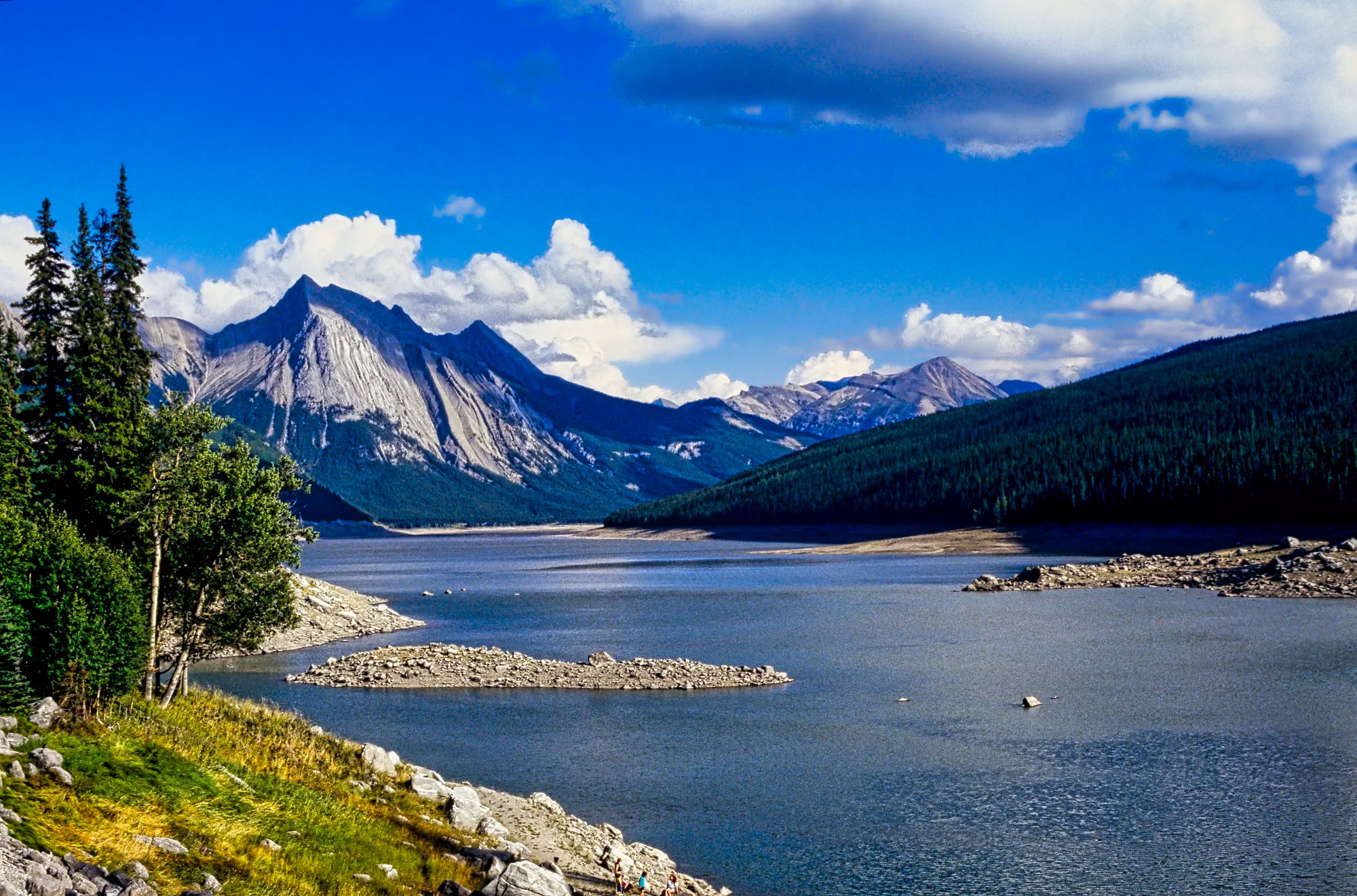 Actually, it is a very peaceful, scenic area — especially compared to Lake Louise. We always had a tradition of walking to the end of the path from the parking lot to get a view. You can not see the full scope of this 22.5 km (14 mi) lake due to the Narrows, an alluvial fan. The gravel you are walking on is the terminal moraine of a once massive 22.5 km glacier.