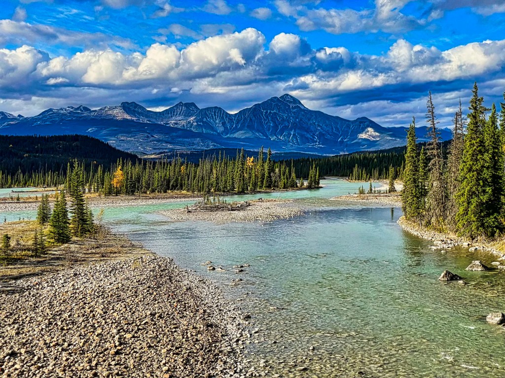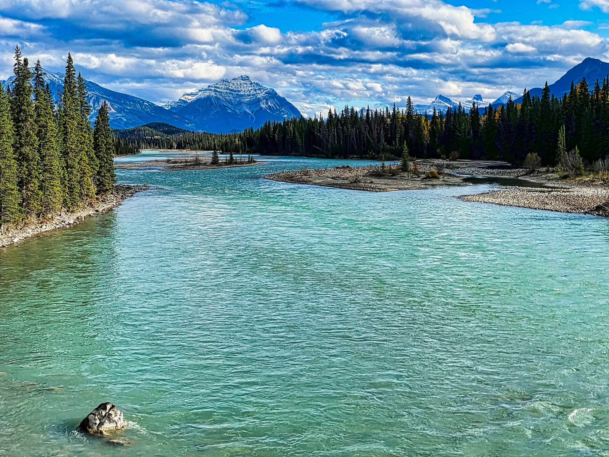 The roaring water comes from the meltwater of the Columbia Icefields. The 1231 km Athabasca River heads north through the Fort McMurray tar sands (heavy oil). It joins the Peace and Mackenzie Rivers to eventually reach the Arctic Ocean.