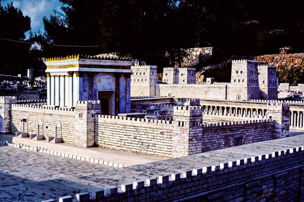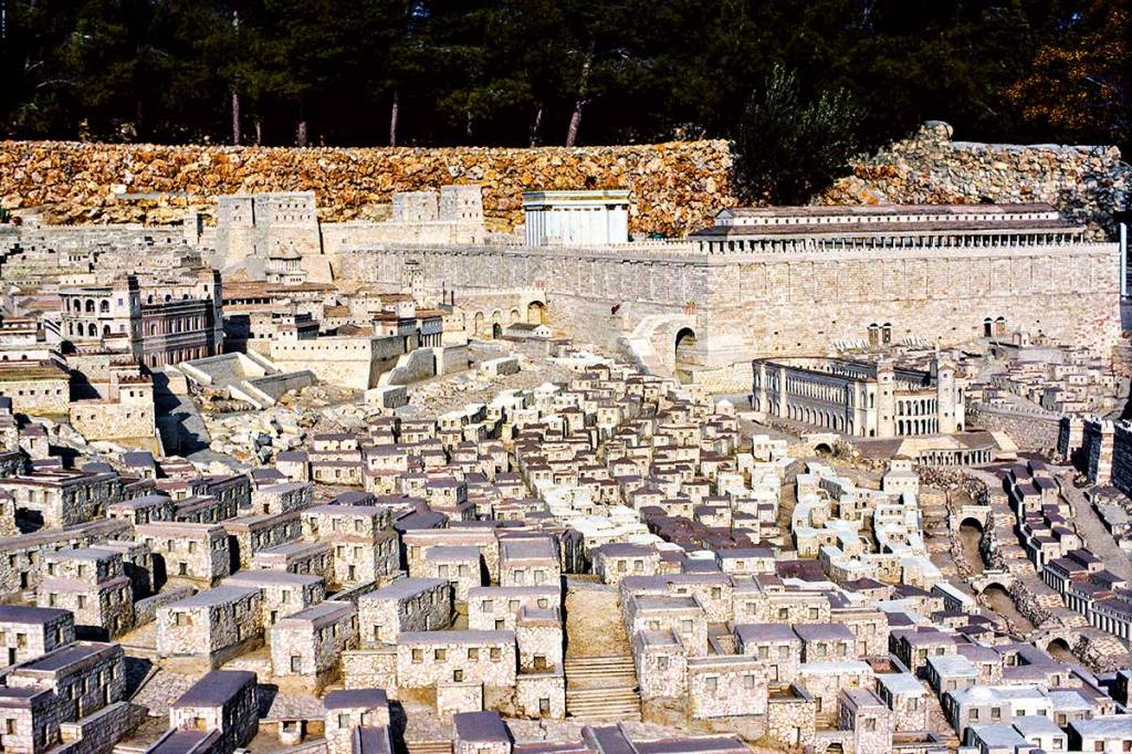 The gold-trimmed Second Temple sat in the same position and dominated as much as the Dome of the Rock does today. This 1:50 scale model was based on the writings of historian Flavius Josephus and other sources. The city is shown in the year 66 when the Great Revolt against the Romans started.