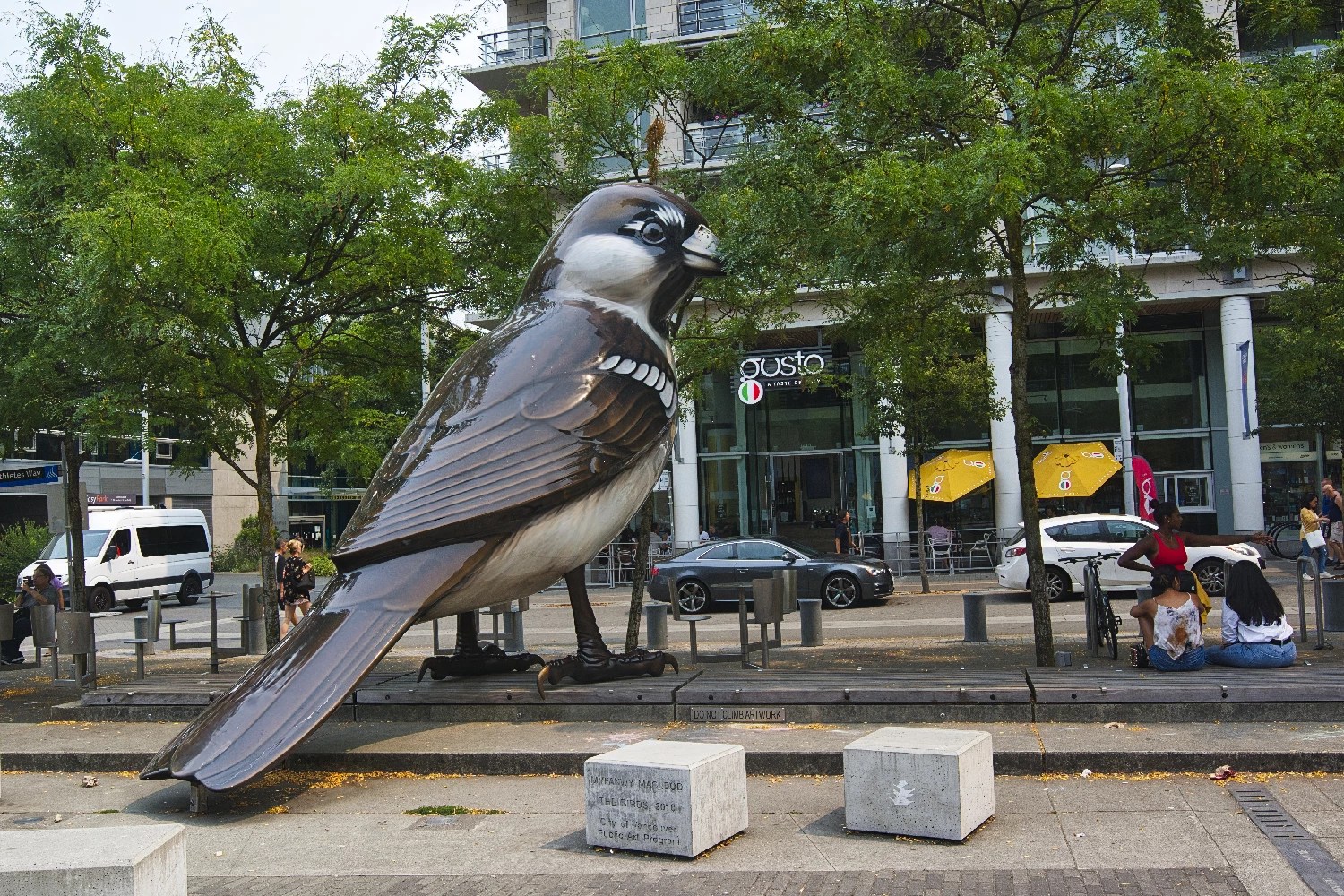 This area used to be a warren of warehouses and factories. These were cleared to build the Olympic village for the 2010 Winter Olympics. The two house sparrow statues were installed after the 2010 Winter Olympics. The Birds by MacLeod was inspired by Hitchcock’s movie The Birds. This used to be an area for immigration. House sparrows are also immigrants as they are not native to North America.
