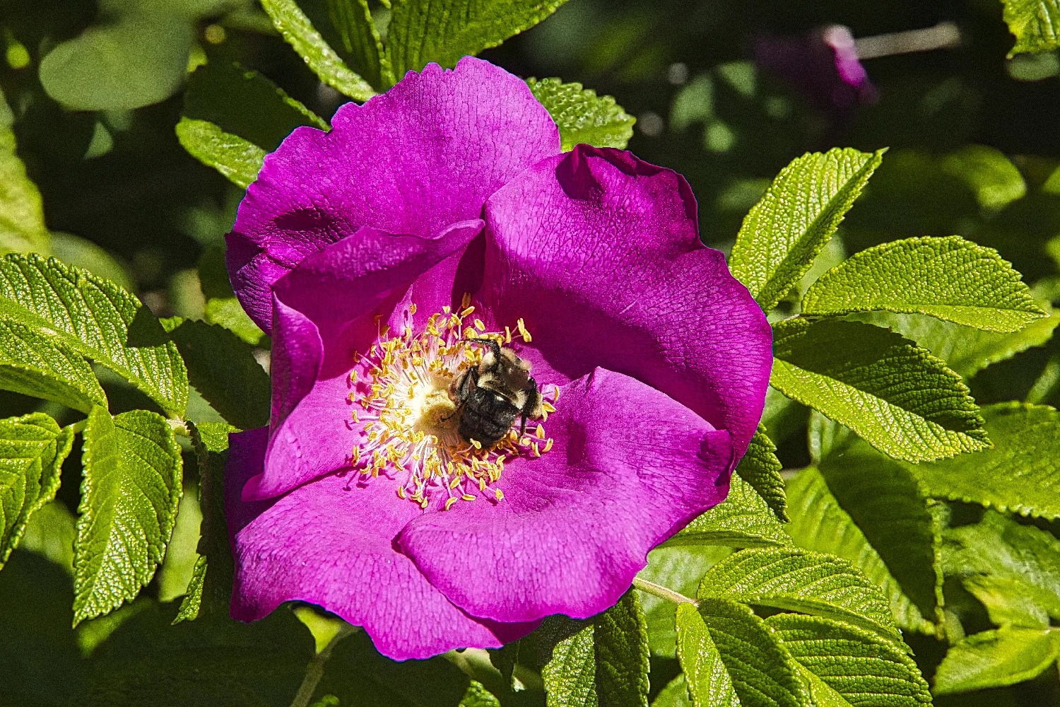 Beautiful flowers decorate the trail. Rugosa Rose is native to northeast Asia and is also known as Japanese Rose. It particularly attracts pollinating insects – note the bee in the photo.