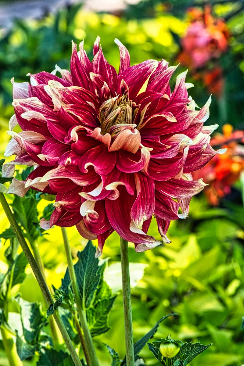 Dahlia, Dahlia pinnata, is native to Mexico and Central America. The family name Asteraceae originates from the Greek word “aster,” meaning star. The blossom looks like a star emitting rays of wavy flames.